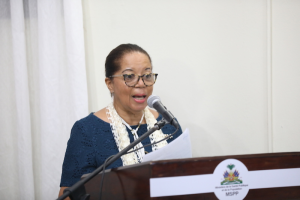 Dans la salle de conférence du Ministère de la Santé publique et de la Population (MSPP), le lundi 22 septembre 2025. Dr Marlyn Carrière Jean-Baptiste est intervenue devant un parterre de responsables, diplomates et partenaires internationaux. Devant le ministre de la Santé publique, Dr Bertrand Sinal, le directeur général du MSPP, Dr Gabriel Thimothé, et le président du Comité de pilotage chargé de la création de l’Institut national du cancer, Dr Joseph Vilaime Alexis, elle a prononcé son discours.
